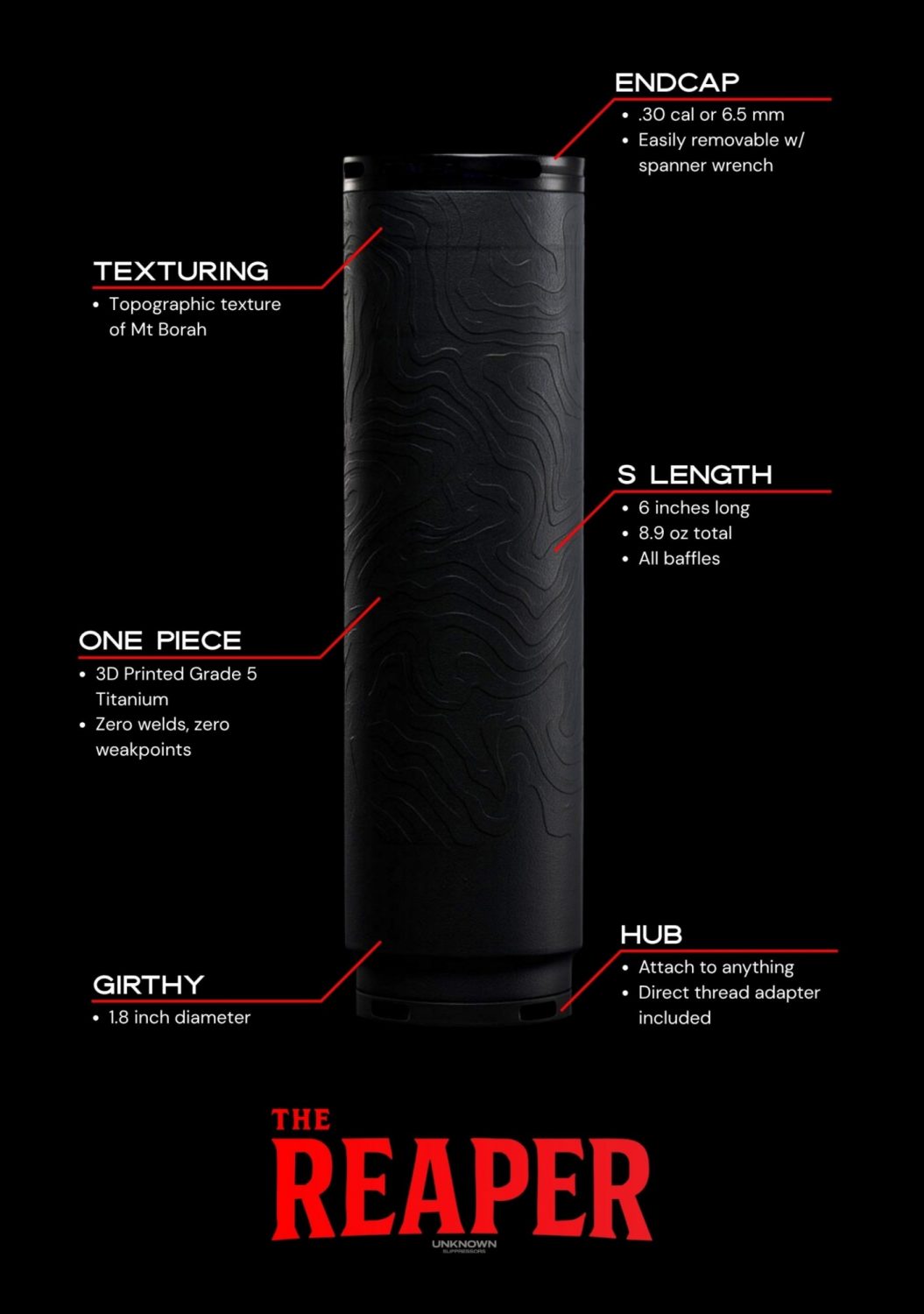 For hunters who demand absolute performance in the field, the Reaper from Unknown Suppressors is built to deliver when it matters most. Designed with precision machining and uncompromising durability, the Reaper provides exceptional sound suppression while maintaining the accuracy and consistency serious hunters rely on.